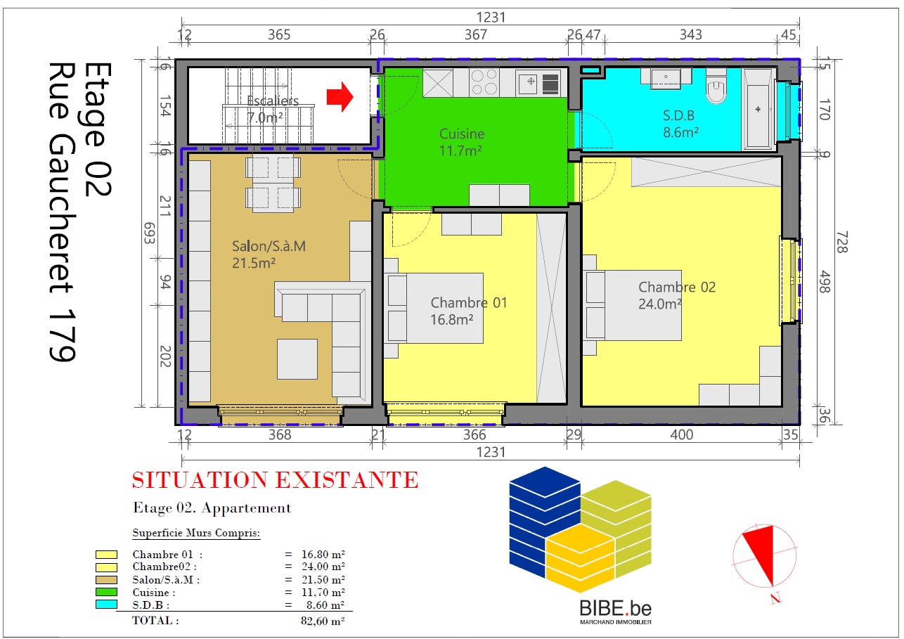 INSCRIPTIONS VISITES UNIQUEMENT VIA LE LIEN SUIVANT : https://www.bibe.be/fr-BE/Details/Index/5981013 Dans un immeuble sans charge , A saisir 1 appartement 2 chambres situé au 2ième étage arrière avec possibilité de terrasse . Situation centrale, situé à 300 mètres du quartier d'Affaires Manhattan ( Tours Proximus,...) entre la gare du Nord et le canal, à proximité immédiate des commerces, des écoles, des transports en commun (métro, tram et bus) et du parc Gaucheret. - Plans téléchargeables sur www.bibe.be 3D: