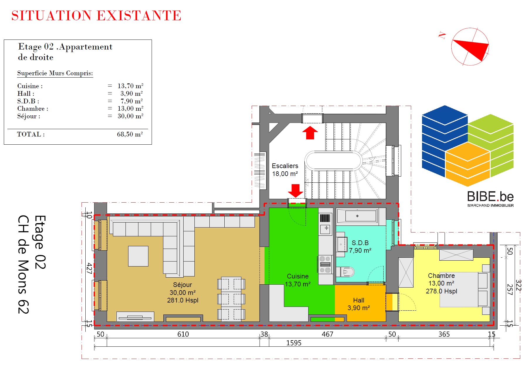A saisir pour les plus rapides dans un immeuble sans charge , situation centrale, à proximité des commerces , écoles et transports . Appartement de 68,50m² d' une chambre situé au 2ieme étage droit + 1 cave comprise dans le prix . . - Visite virtuelle 360° , 3D ,https://drawbotics.floorplanner.com/projects/95626740-1ier-et-2-ieme-droit-mons-62/spaceplanner Plans téléchargeables sur www.bibe.be.