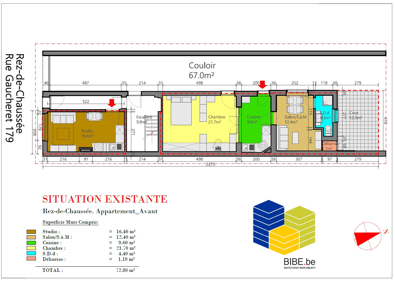 INSCRIPTIONS VISITES UNIQUEMENT VIA LE LIEN SUIVANT : https://www.bibe.be/fr-BE/Details/Index/6008513 ---PAS DE FONDS DU LOGEMENT-- A saisir appartement situé au rez-de-chaussée avant ( appartement coupé en 2 par la cage d'escalier) avec possibilité de terrasse de 12m² (à réaliser en retirant une toiture plate ) . Situation centrale, situé à 300 mètres du quartier d'Affaires Manhattan ( Tours Proximus,...) entre la gare du Nord et le canal, à proximité immédiate des commerces, des écoles, des transports en commun (métro, tram et bus) et du parc Gaucheret. Actuellement le bien est occupé en 2 unités 1 appartement 1 chambre de 56,40 m² + 1 studio de 16,40 m² + 1 cave - Plans téléchargeables sur www.bibe.be 3D: